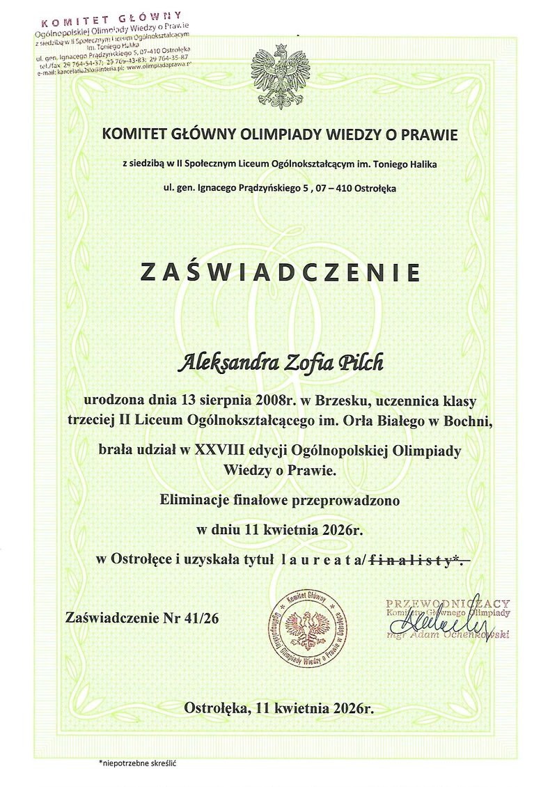 To powód do ogromnej dumy dla całej społeczności szkoły! Aleksandra Pilch, uczennica klasy mundurowej IIIE, została laureatką finału XXVIII Ogólnopolskiej Olimpiady Wiedzy o Prawie.