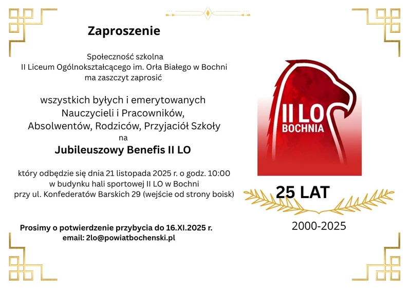 Społeczność szkolna II Liceum Ogólnokształcącego im. Orła Białego w Bochni ma zaszczyt zaprosić byłych i emerytowanych Nauczycieli i Pracowników, Absolwentów, Rodziców oraz Przyjaciół Szkołyna wyjątkowe wydarzenie – Jubileuszowy Benefis II LO, który odbędzie się 21 listopada 2025 r. (piątek) o godz. 10:00 w budynku hali sportowej II LO w Bochni, przy ul. Konfederatów Barskich 29 (wejście od strony boisk).